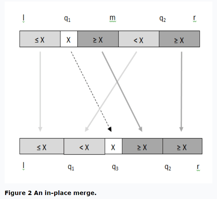 The main idea for in-place merge, illustrated in Figure 2, is based on a modification to the not-in-place merge. Instead of moving a single element X at location q1 to location q3 at each recursive step, all elements between q1 and q2 are moved using In-Place Block Swap (Block Exchange). Let’s go through this in detail.
