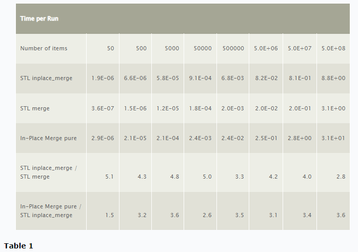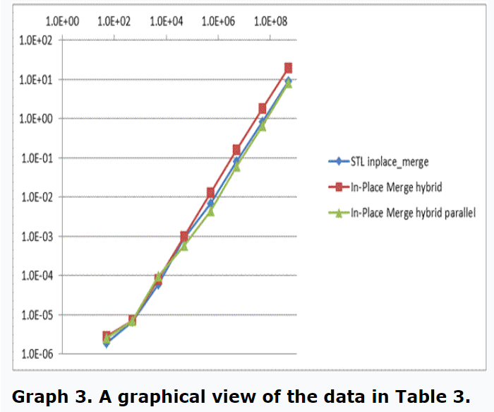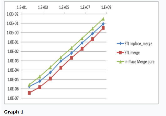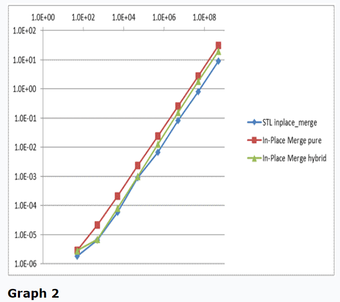 Performance of several in-place and not-in-place merge algorithms is shown in Table 1 and in Graph 1.