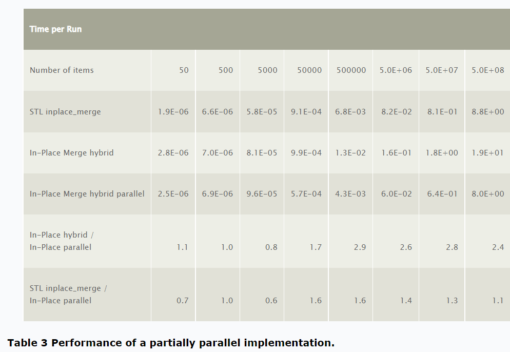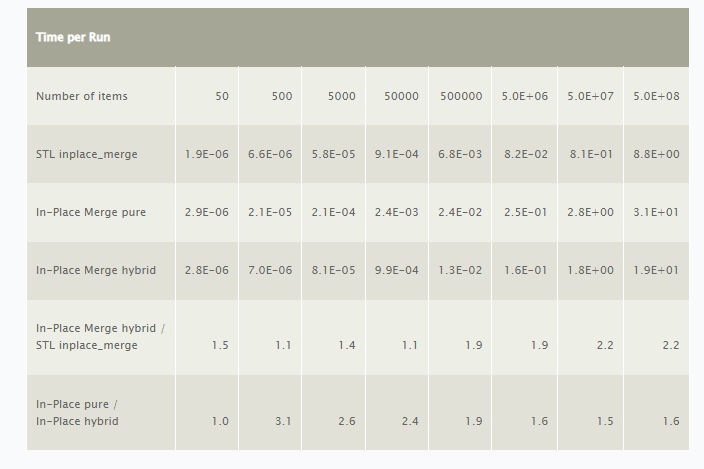 Note that the in-place merge algorithm used a non-optimized non-hybrid block swap algorithm, for simplicity. An optimized hybrid algorithm is definitely a performance boosting opportunity.