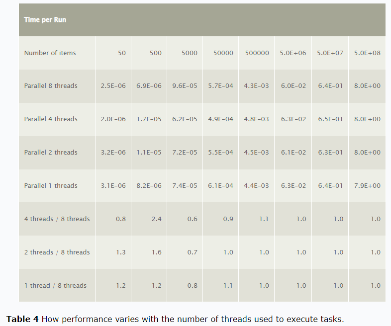 Table 4 shows how performance varies with the number of threads used to execute tasks.