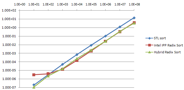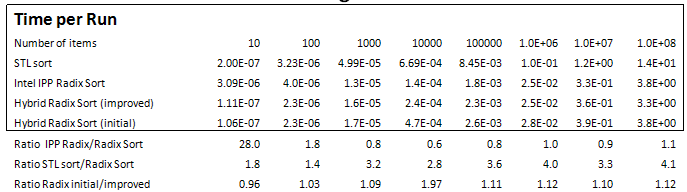 Comparing to Intel’s IPP Radix Sort for 32-bit integers it was comparable in performance for larger array sizes and smaller sizes, but lagged in the mid-size (1K to 100K). For 16-bit and 8-bit it lagged IPP Radix Sort by about 2X and about 4X respectively. 64-bit performance could not be compared since IPP did not implement it.