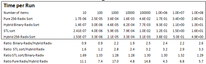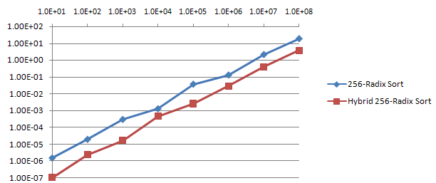 The In-place Hybrid Binary-Radix Sort I presented in Algorithm Improvement through Performance Measurement: Part 2 sorted arrays of numbers (8, 16, 32 and 64-bit, signed and unsigned) in linear time. The algorithm was shown to outperform the STL sort, but not the Radix-Sort that’s part of Intel’s Integrated Performance Primitives (IPP) library. However, it offered the ability to perform sorting without using extra storage (“in-place”), whereas Intel’s IPP Radix-Sort requires additional storage of equal size to the input array.