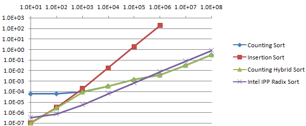 Counting Sort will be explored in more detail in future articles, since its performance needs to be examined closer due to concerns about sustainable superior performance depending of input data statistics. The above measurements show potential.