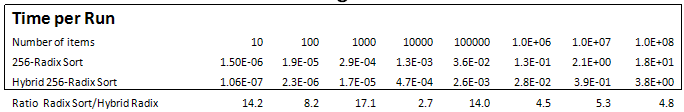 It is simple to convert the initial 256-Radix Sort implementation to a Hybrid implementation by letting Insertion Sort handle any recursion for a small number of elements. This strategy was used successfully by STL sort and by Hybrid Binary-Radix Sort in (see Algorithm Improvement through Performance Measurement: Part 2). In the case of Hybrid Binary-Radix Sort the performance was improved by about 30%. However, 256-Radix Sort has a substantially larger overhead than Hybrid Binary-Radix Sort or Insertion Sort, which shows up in measurements shown in Table 1 and Graph 1, where Insertion Sort is significantly faster for input data set under 1K elements. Table 2 and Graph 2 compare non-Hybrid and Hybrid implementations of 256-Radix Sort.